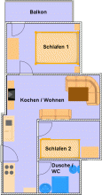 Ferienwohnung mit 2 separaten Schalfzimmern (1xDoppelbett, 1xStockbett), Wohnbereich mit Küchenzeile, Bad mit Dusche und WC. Die Bettwäsche wird von uns gestellt und ist bei Anreise bereits bezogen.