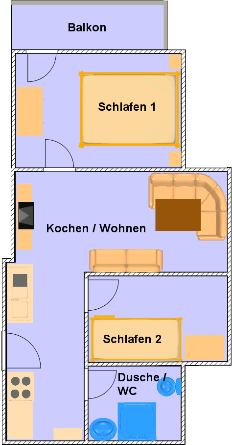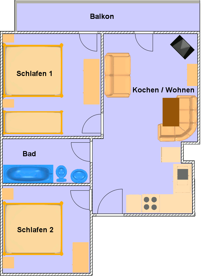 Ferienwohnung mit zwei separaten Doppelbettschlafzimmern, Wohnbereich mit Küchenzeile, Bad mit Dusche/Badewanne und WC. Die Bettwäsche wird von uns gestellt und ist bei Anreise bereits bezogen.